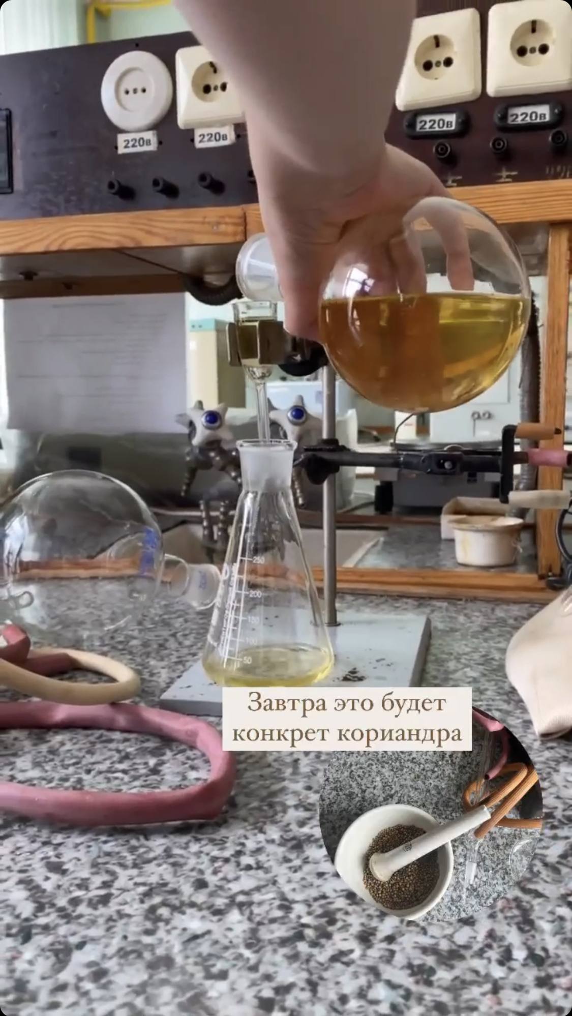 В зависимости от характера растительного сырья (плоды, листья, почки, кожура), свойств эфирных масел для их извлечения применяют разные способы, позволяющие получить наибольший выход и наилучшее качество продукции. И в рамках моего интенсива вместе с супер преподавателем и доцентом кафедры БГТУ Вячеславом Флейшером мы произвели эфирное масла разными способами: гидродистилляция, перегонка с паром, экстракция растворителем. Каждый участник забрал с собой 3 флакончика своего собственного эфирного масла. Для наших занятий мы использовали лабараторное оборудование: собирали и подготавливали его вместе.